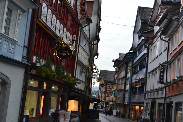 5分あれば通り抜けられてしまう小さな街に、スイスらしい鱗型の赤錆びた屋根瓦と繊細なフレスコ画で彩られた家々がぎゅっと凝縮されている。