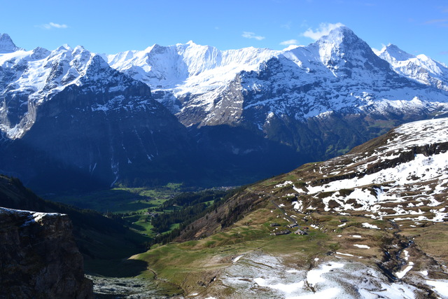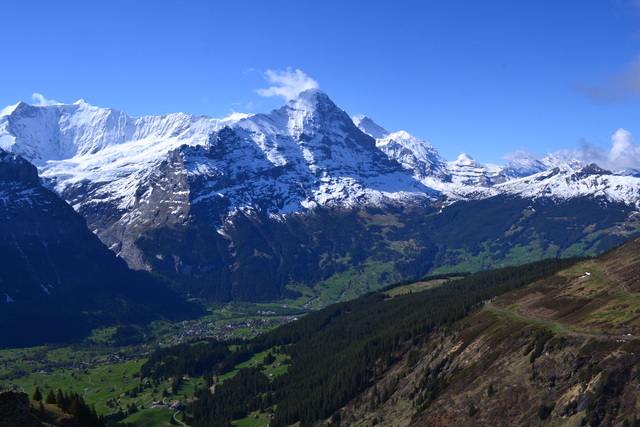 氷河が作り出したU字谷の底にある村。風景の美しさゆえに最近では観光客が押し寄せて観光公害が問題になっている。この断崖絶壁の上には村があって、左の崖の上にあるのがWengen村。右の崖の上にあるのがMuerren村。