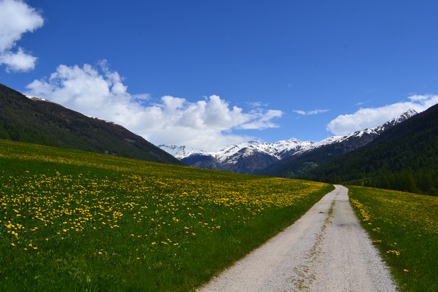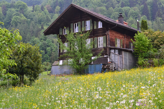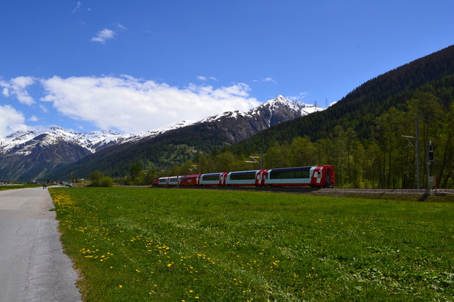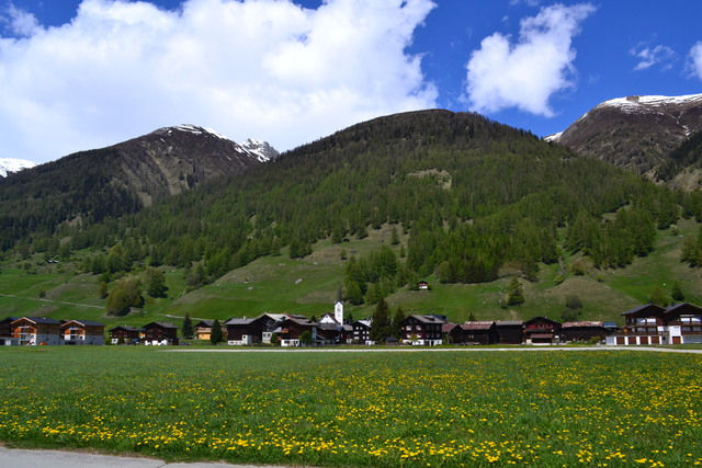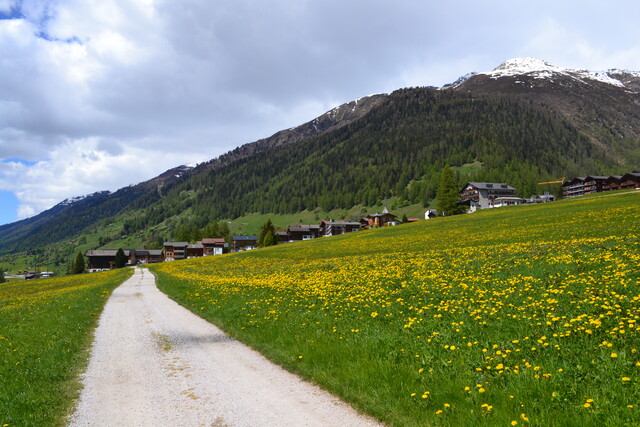 ローヌ氷河が削ってできた谷にあるミュンスター村。カラマツの木を組んだ編物建築は Walserhaus と言って中世にヴァルザー人がアルプスの谷間に定住したときの建築様式。一面に咲き誇るタンポポと遠くに見渡す雪山。風が気持ちいい。スイスの赤い電車が映えます。