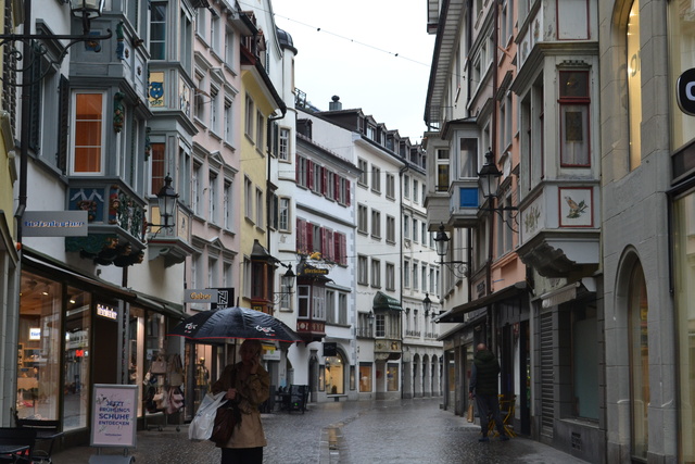 チューリッヒといえばヨーロッパの世界都市だが、 旧市街の様子は牧歌的で、村の農村共同体がそのまま大きくなってできた都市のようなのどかさを感じる街だ。 チューリッヒの建物はグレーがかった白壁のものが多い。 空の青、チューリッヒ湖の青、森の緑、チューリッヒ湖の向こうに広がるアルプスの白。 コントラストがとても美しい街だった。